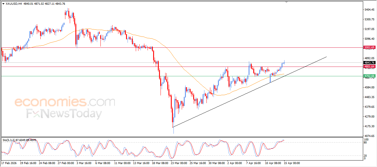 Guld steg under sin seneste intradagshandel, hvilket bekræftede et udbrud over det stærke modstandsniveau på $4.800. Denne bevægelse er et teknisk signal, der afspejler et stærkt bullish momentum og prisens parathed til at fortsætte med at stige. Den positive bevægelse understøttes af prisbevægelser langs en kortsigtet stigende korrigerende trendlinje, udover dens stabilitet over EMA50, som fortsat yder dynamisk støtte og forstærker chancerne for yderligere stigninger.