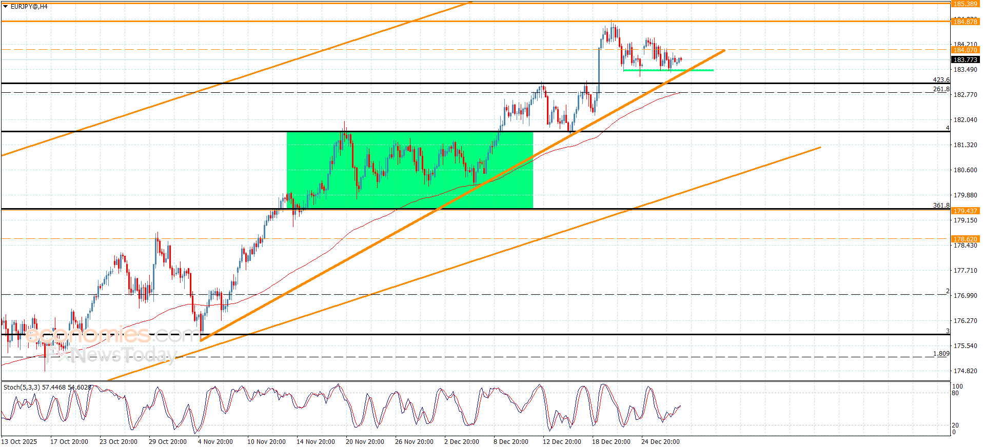 EURJPY-parret begyndte at aktiveres med de vigtigste indikatorers positive tendens for at afslutte de bearish korrigerende forsøg efter at have ramt niveauet 183,40, hvilket repræsenterer en forlængelse af den primære bullish kanals støtte.