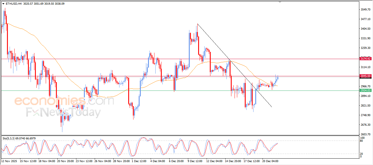 Prisen på (ETHUSD) steg i den seneste intradagshandel og nåede den nuværende modstand på $3.045, understøttet af den fortsatte handel over EMA50, påvirket af et brud på en mindre bearish trendlinje på kort sigt, udover fremkomsten af positive signaler på de relative styrkeindikatorer, efter at have nået oversolgte niveauer.