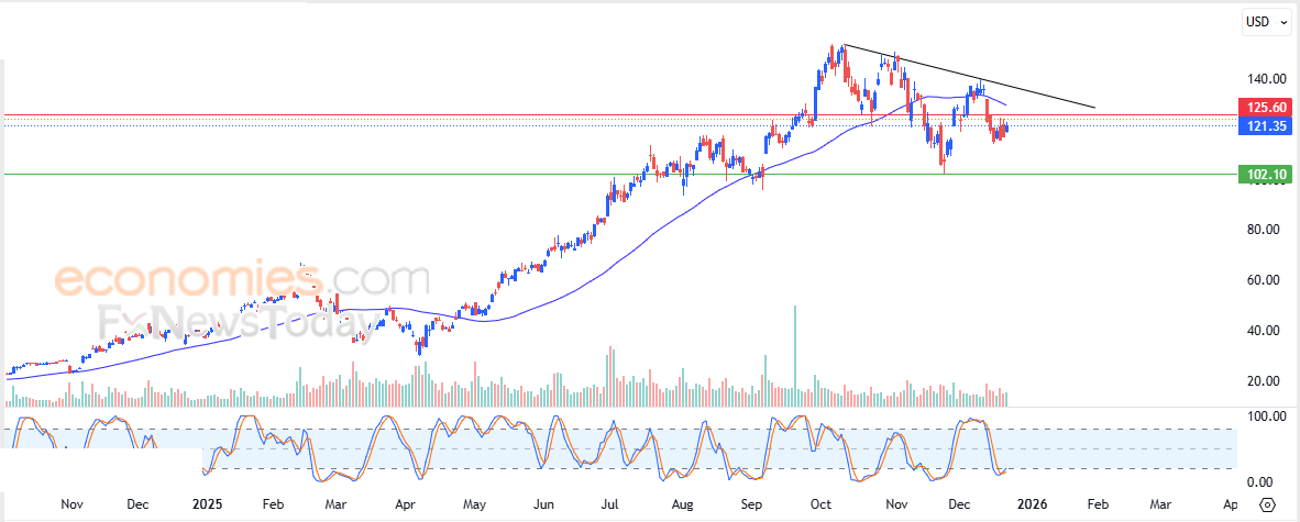 Derfor forventer vi, at aktien vil falde i den kommende handel, især så længe den forbliver under modstandsniveauet på $125,60, med sigte mod det centrale støtteniveau på $102,10.