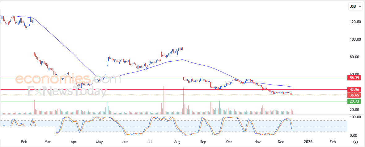 Derfor forventer vi, at aktien vil falde i den kommende handel, så længe den forbliver under modstandsniveauet på $42,95, med et sigte mod støtteniveauet på $29,75.